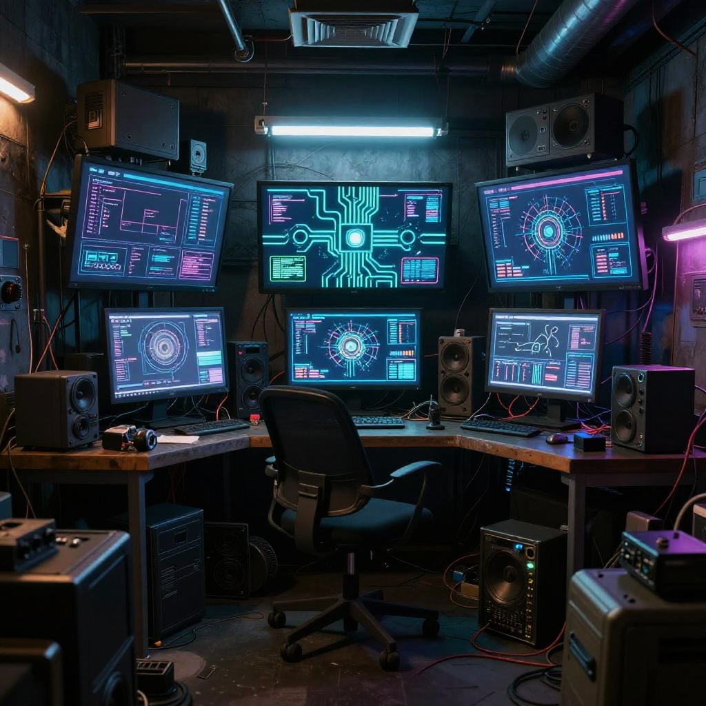 Interior of a cyberpunk-style hacker's den featuring a cluttered workspace with multiple glowing holographic screens displaying circuits and digital data. The room is dimly lit with neon blue and purple lighting, combining old and futuristic technology elements, including speakers, cables, and computer hardware. The high-tech but gritty ambiance reflects a futuristic digital environment.