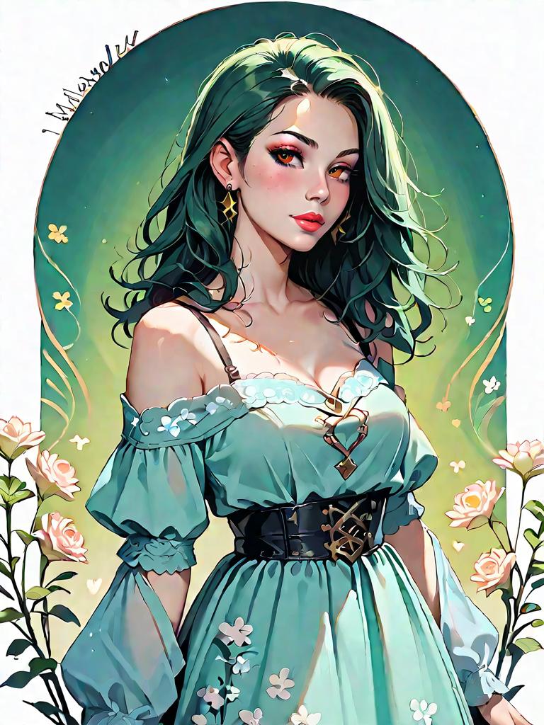 Digital illustration of a dark fantasy themed woman standing in shallow water at night. She has long blue hair and wears a fitted midnight blue velvet romper with scalloped lace edges, long sleeves, and flared shorts. The background features a large circular ornate design and a misty, starry night sky with soft clouds.