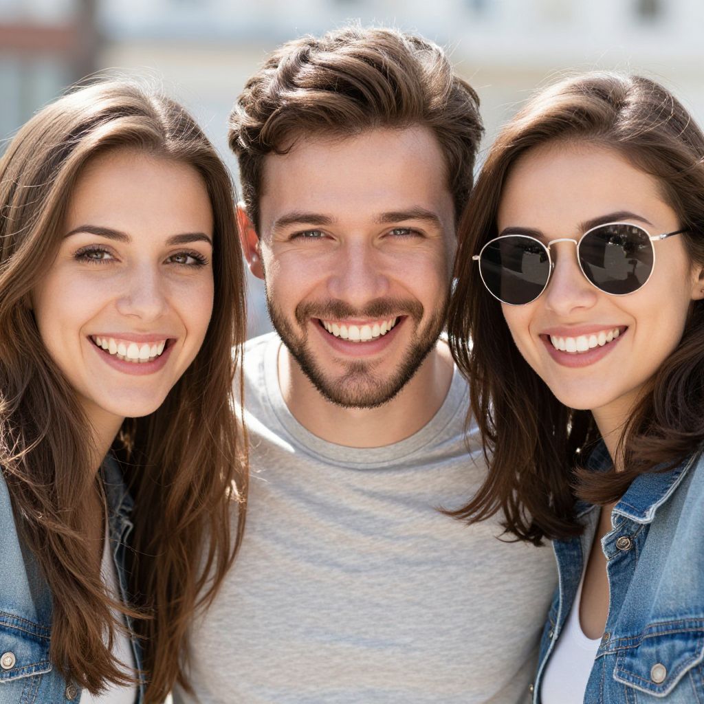 Photograph of three happy friends in a close-up shot. The guy in the middle has brown hair, a beard, and is wearing a light gray t-shirt, smiling brightly. On the left, a woman with long brown hair and a wide smile. On the right, another woman with shoulder-length brown hair, wearing sunglasses and a denim jacket, also smiling. The background is blurred and sunny.