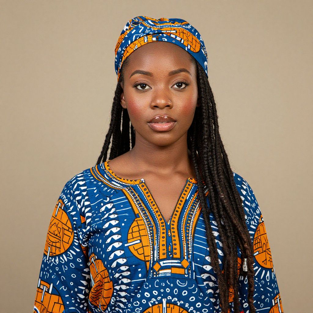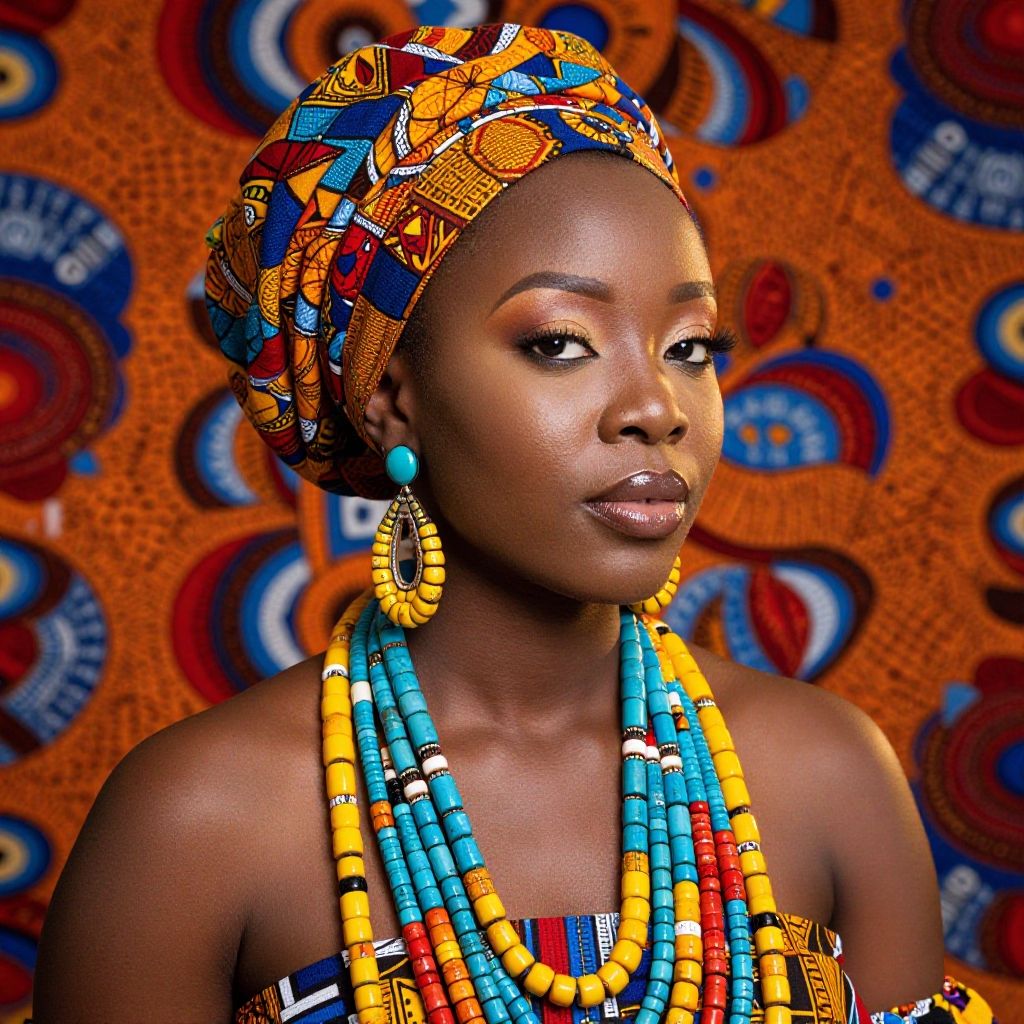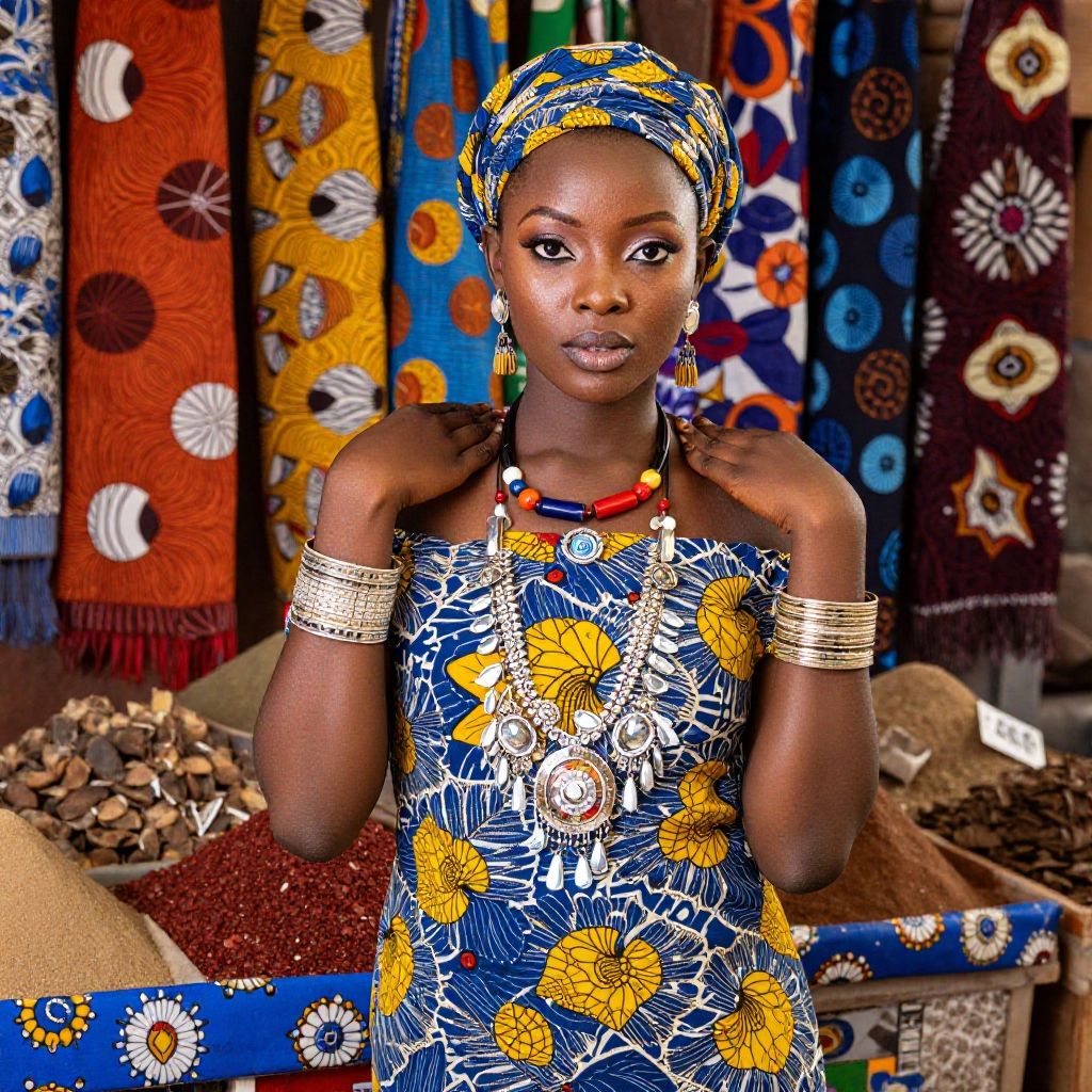 Guinea beautiful woman standing in a marketplace, colorful fabrics and spices around, traditional jewelry sparkling, rich cultural ambiance, detailed facial features and confident posture