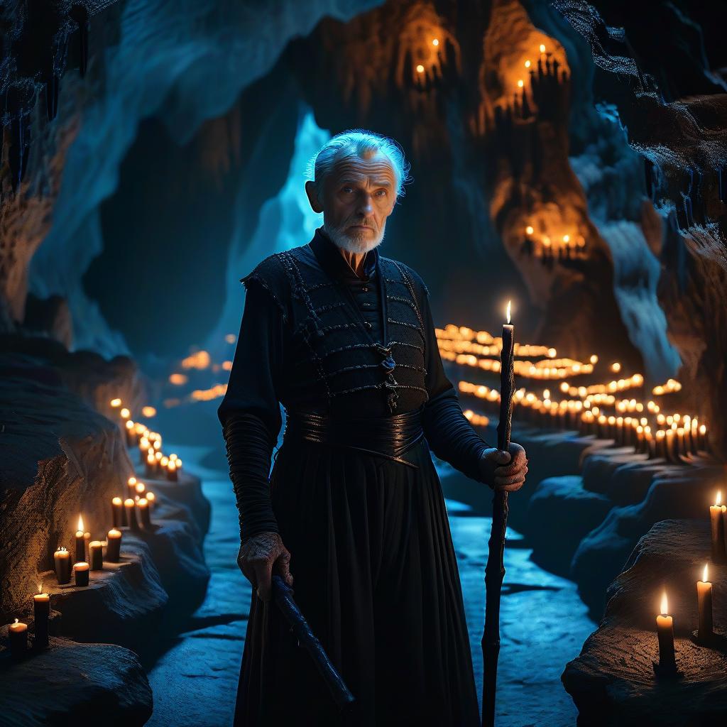 Night Photography a highly detailed cinematic photo of old man with blue eyes in mystical cave with rows of lit black candles at different heights. She holds wooden staff in her hand. She wears a black tight bodysuit, 50 mm lens, f/2.4, accent lighting, global illumination, Nikon D810