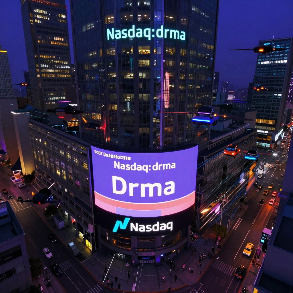 Nasdaq:drma aerial view of a futuristic city with financial towers illuminated by bright ads and billboards displaying nasdaq:drma stock information, busy flying cars and drones creating lines of light in the sky, cyberpunk art style with neon purples and blues