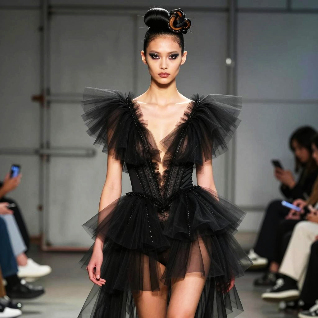 Fashion model with Asian features walking on runway wearing an avant-garde black dress made of layered tulle fabric with intricate detailing. The dress features dramatic ruffles on shoulders and skirt with a deep V neckline. The model has a bold hairstyle styled with sculptural elements and dark smoky eye makeup. The setting is an industrial indoor fashion show with seated audience in the background.