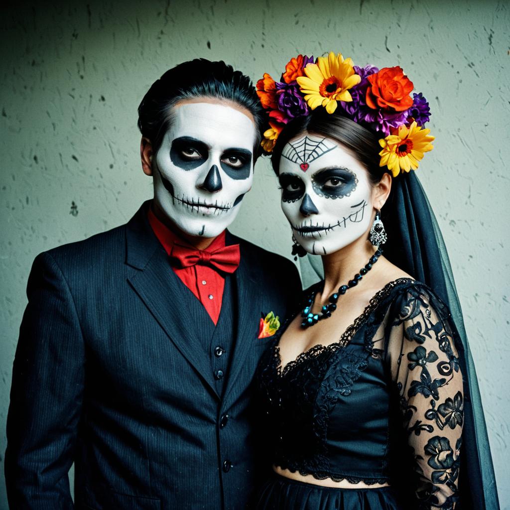 Catrina Costume Man, woman with a skull make up and flowers in her hair