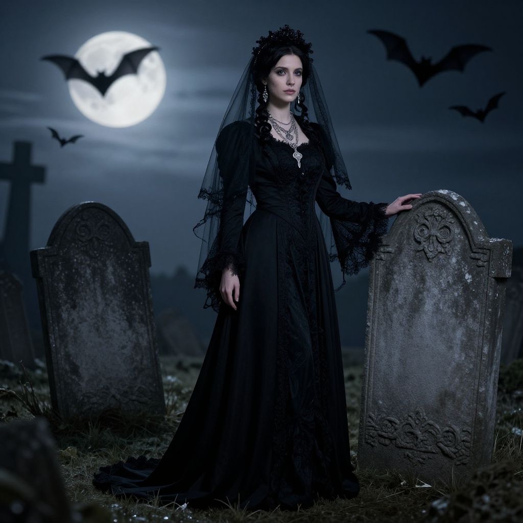 Tombstone womens costume inspired by Victorian mourning attire, complete with a flowing black gown, delicate veil, and intricate silver jewelry, standing beside weathered tombstones under a moonlit sky with bats flying overhead for a haunting atmosphere.