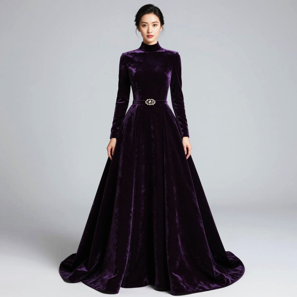 A woman elegantly poses in a luxurious deep purple velvet gown with long sleeves and a high neckline. The dress features a full, floor-length skirt with a subtle train and is accented by a decorative belt, highlighting a sophisticated and classic style.