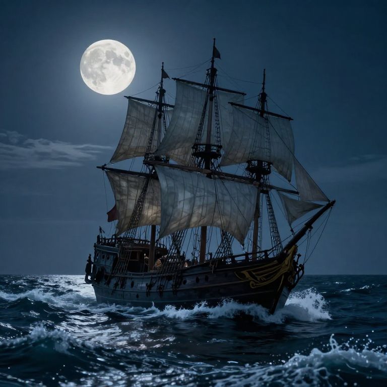Under the watchful gaze of a luminous moon, a spectral pirate ship drifts through the restless sea, its sails whispering ancient tales of freedom and loss, while the crashing waves echo the eternal dance between hope and oblivion.