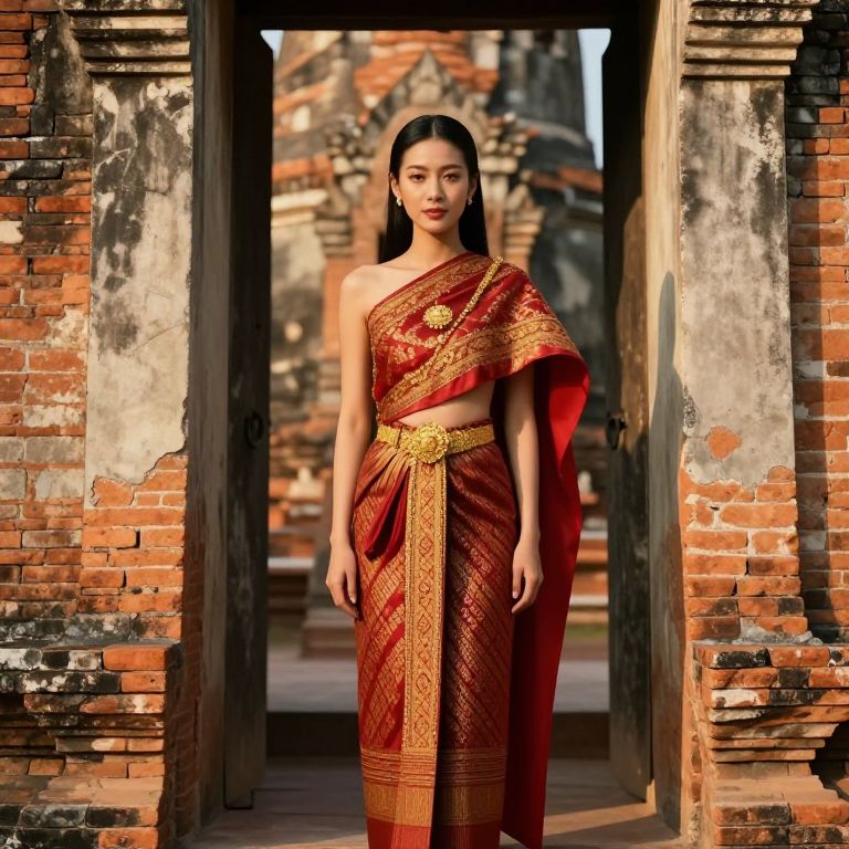 A cinematic image of a Thai female in traditional national attire standing at a temple gate in Phra Nakhon Si Ayutthaya, wearing a long, flowing red and gold silk garment with intricate patterns, her face lit by golden hour sunlight; she has full, smooth skin, straight black hair pulled back lightly, and a serene, respectful expression reflecting the cultural solemnity of the moment.