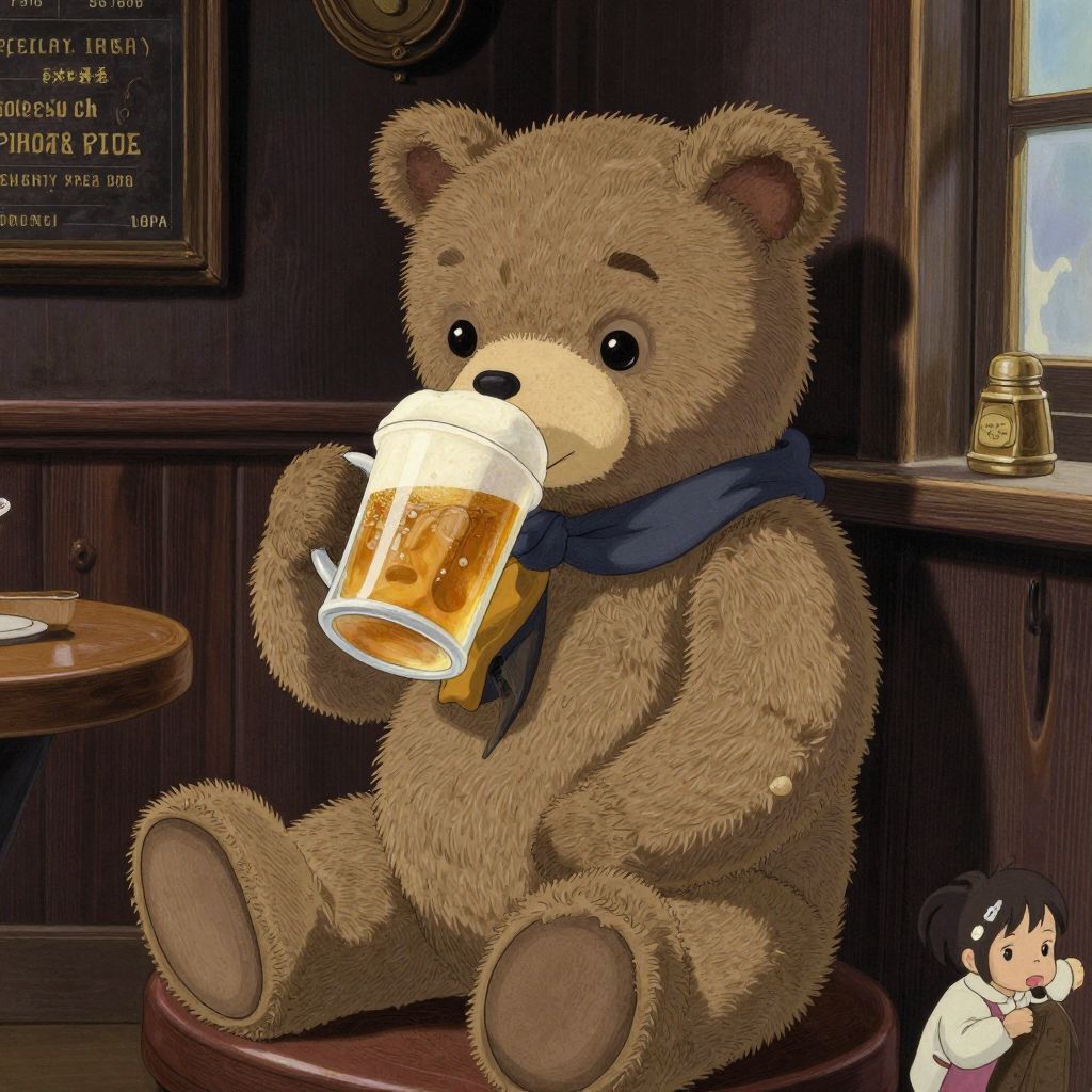 Anthropomorphic brown bear in a navy and white letterman jacket with an "A", smoking against a full moon in a dark forest. Digital illustration