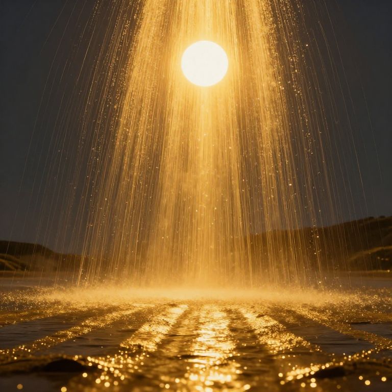 Photograph of a vivid golden sunset over a calm body of water. The bright sun is centered at the top, casting a radiant beam of light downward, creating a dense shower of golden rays and sparkling water droplets. The water below reflects the sun's glow, forming a shimmering golden path. The dark, almost black sky contrasts sharply with the intense yellow and gold hues of the sun and water. The horizon in the background is faintly visible, with silhouetted landforms. The overall image has a magical, ethereal quality, emphasizing the beauty and power of natural light.
