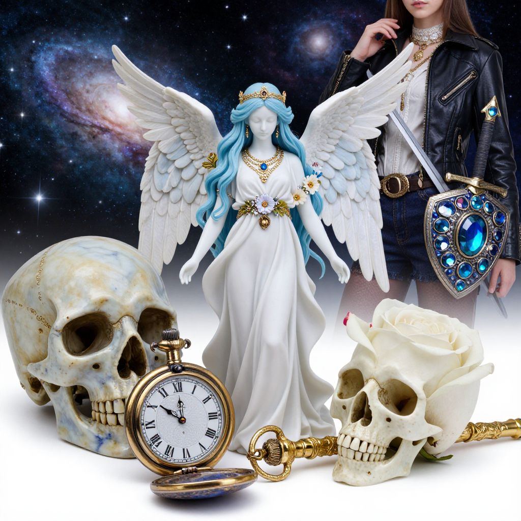 Photograph of a surreal, gothic-themed composition. Centered is a white, winged angel statue with blue hair, wearing a golden necklace and holding a floral wreath. Surrounding the statue are two large, detailed white skulls, one with an ornate pocket watch in front of it, another with a smaller, golden watch. To the right, a partially visible woman in a black leather jacket and white dress holds a blue gem-encrusted shield. Background features a starry, cosmic galaxy with swirling nebulae. The textures include smooth porcelain for the angel, rough bone for the skulls, and metallic for the watches and shield.