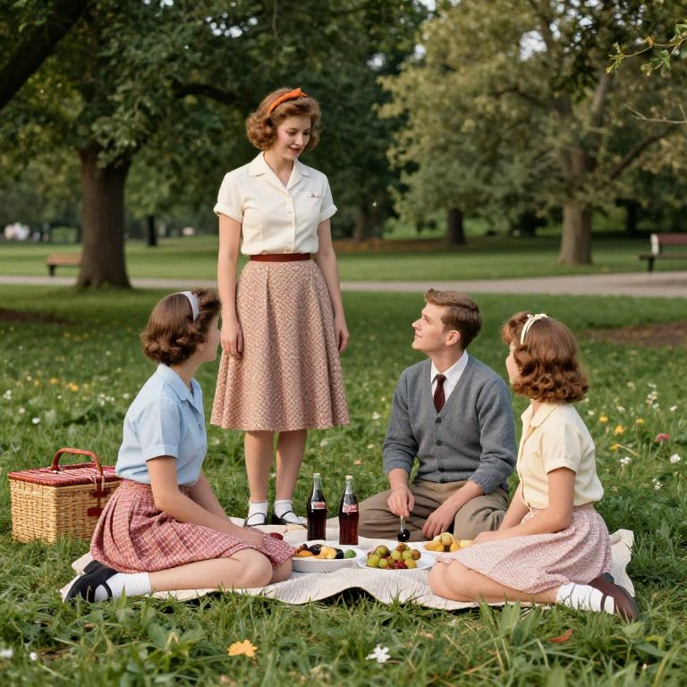 1950's outfits outdoor picnic scene, families dressed in vintage clothing, poodle skirts, cardigan sweaters, rolled-up trousers, picnic baskets and classic soda bottles, lush green park setting, soft golden hour lighting, realistic but nostalgic mood