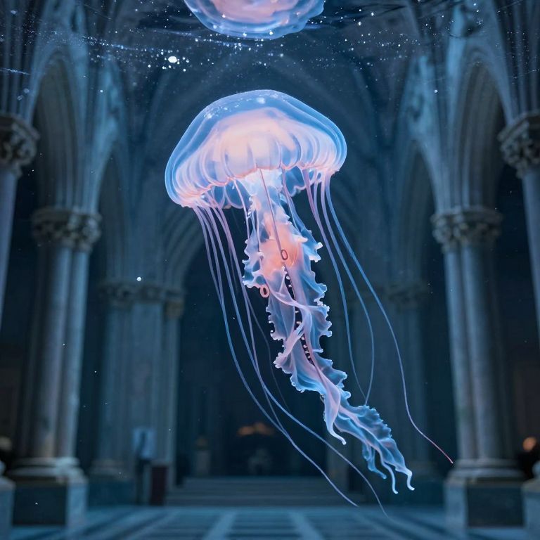 Photograph of a glowing, translucent blue jellyfish with delicate, flowing tentacles, suspended mid-air in an ornate, Gothic-style cathedral. The jellyfish's ethereal light contrasts with the dark, stone arches and columns lining the background. A smaller jellyfish hovers above, adding to the surreal atmosphere. The cathedral's intricate details, including pointed arches and stone carvings, are softly lit, creating a mystical ambiance. The jellyfish's translucence allows hints of pink and orange hues to be seen through its body.