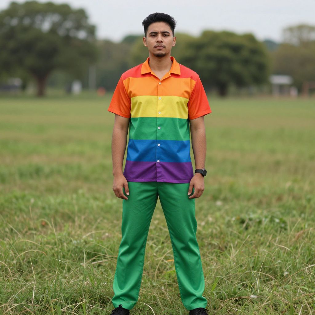 Photograph of a young man with short black hair, wearing a rainbow-striped shirt and green pants, standing in a grassy field. Background features blurred