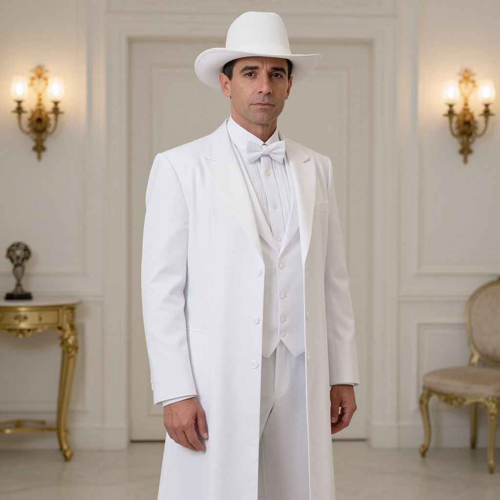 Photograph of a middle-aged man standing in a luxurious, elegant room. He has a medium build, olive skin, and short dark hair. He is wearing a white, long, three-piece suit with a bow tie and a wide-brimmed white hat. The background features white paneled walls, two ornate brass wall sconces with warm light, a small gold table with a decorative statue, and a cream-colored upholstered chair with a curved back. The overall style is sophisticated and classic, with a focus on white and gold tones.