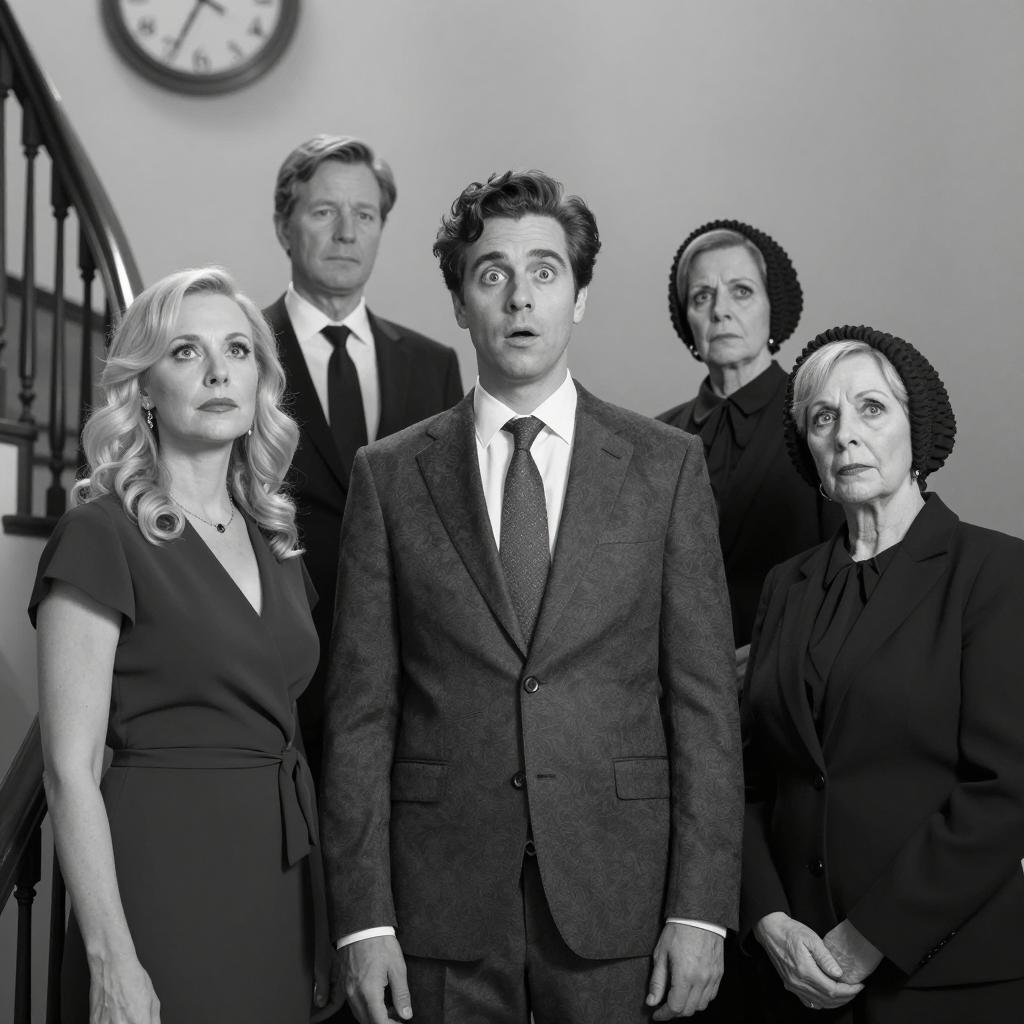 Studio portrait of three people with a blue background. The man in the center has short dark hair, wearing a dark suit with a white shirt and black tie, showing a slight smile. The woman on the left has curly red hair, wearing a purple top and a pearl necklace, smiling warmly. The woman on the right has black hair, wears a beige hat and a patterned top, also smiling. Both women are standing slightly behind the man with their hands resting on his shoulders.