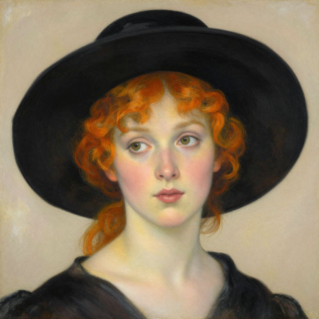 Maurice Laurencin's portrait depicts a young woman with vibrant orange curls framed by a wide-brimmed black hat, her serene gaze directed slightly upward against a soft beige background.