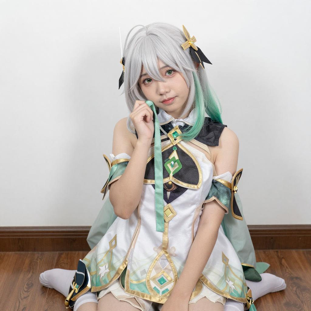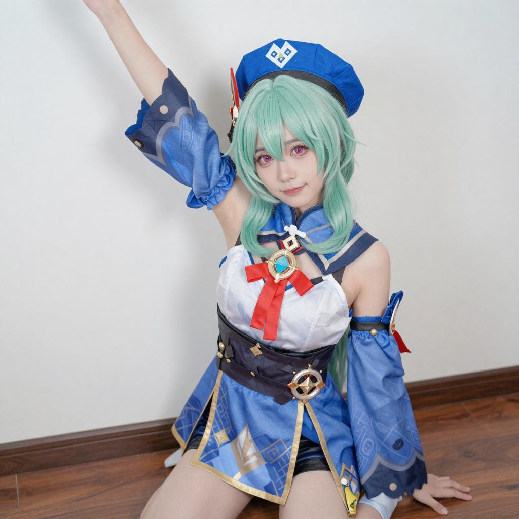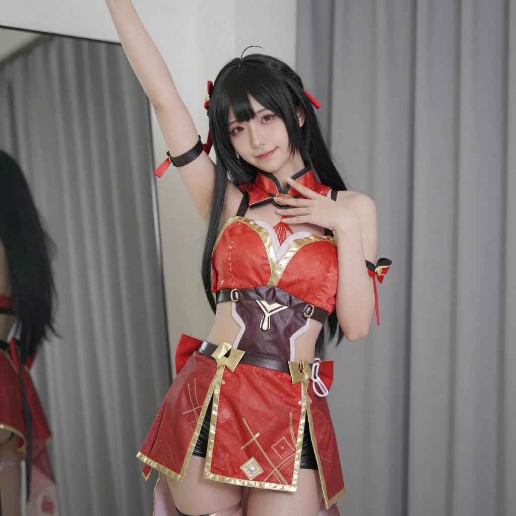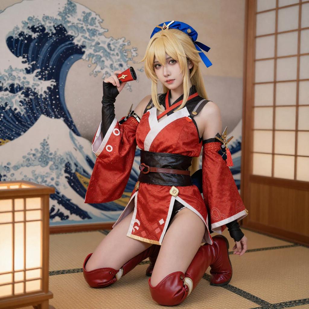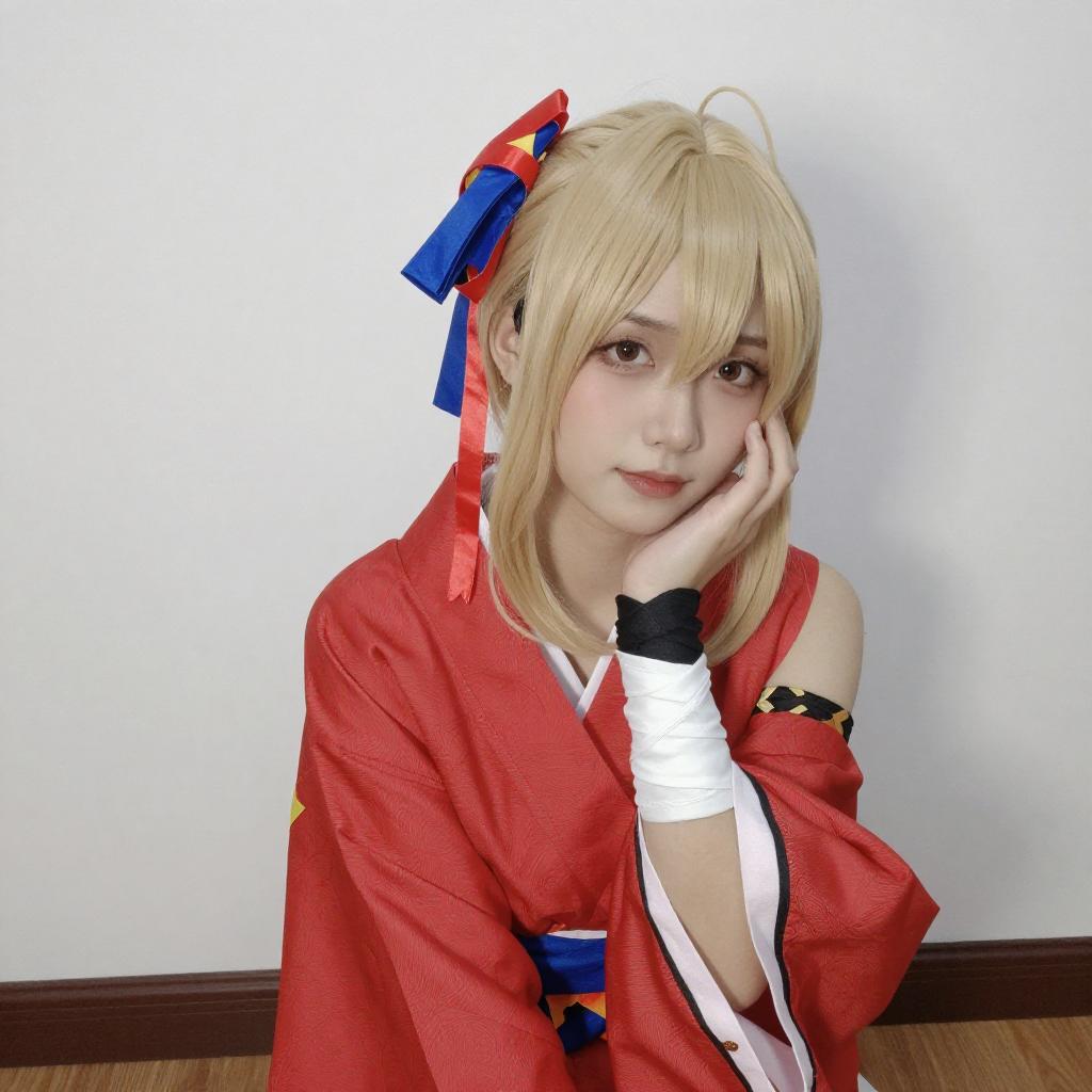 Photograph of a blonde cosplayer with elf-like ears, wearing a red and white outfit with black gloves, and a blue and red hair accessory. She has a red flower tattoo on her chest, is kneeling on a wooden floor, and is pointing forward with a slight smile. Background is a plain white wall.