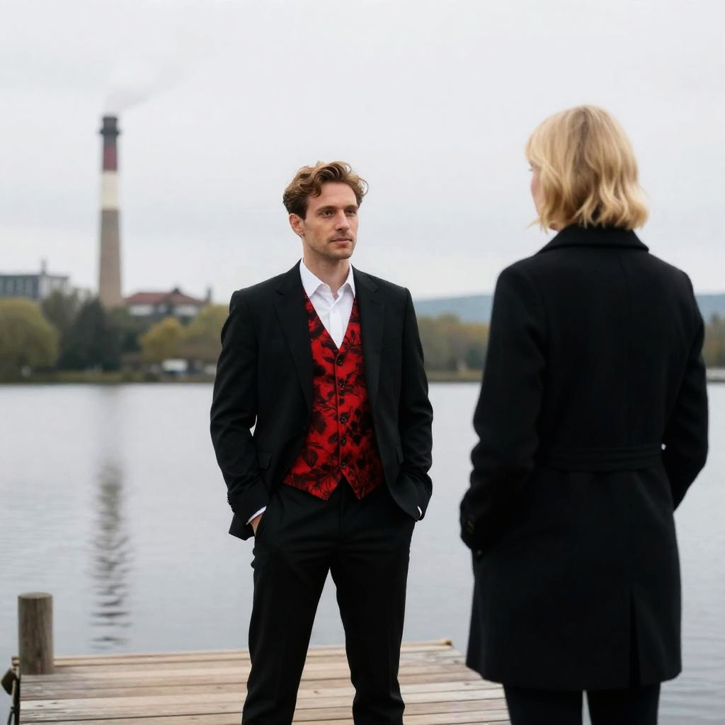 Photograph of a man in a black suit with a red floral vest standing on a wooden dock, facing a blonde woman with a shoulder-length bob haircut in a black coat. Industrial smokestack in the background. Calm lake with green hills in the distance. Man with hands in pockets, woman with back to camera. Overcast sky.