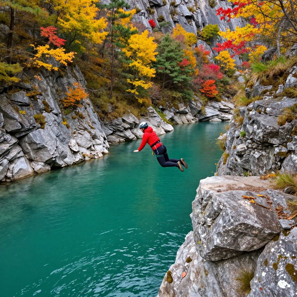 A person wearing a red jacket and helmet is captured mid-air while cliff jumping into clear turquoise water surrounded by rocky cliffs adorned with vibrant autumn foliage in shades of yellow, red, and green. The scene showcases dynamic outdoor adventure in a scenic, colorful natural landscape.