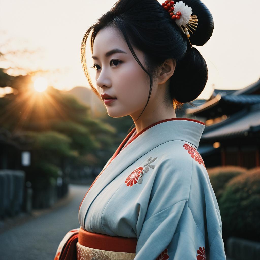 Realistic photo.photographic portrait of a stunningly beautiful Japanese geisha in soft dreamy light at sunset, Kyoto, soft focus, contemporary fashion shoot, captured on Fujifilm GFX 100, in a Hayao Miyazaki movie, by Edward Robert Hughes, extremely detailed, breathtaking, hyperrealistic, perfect face
