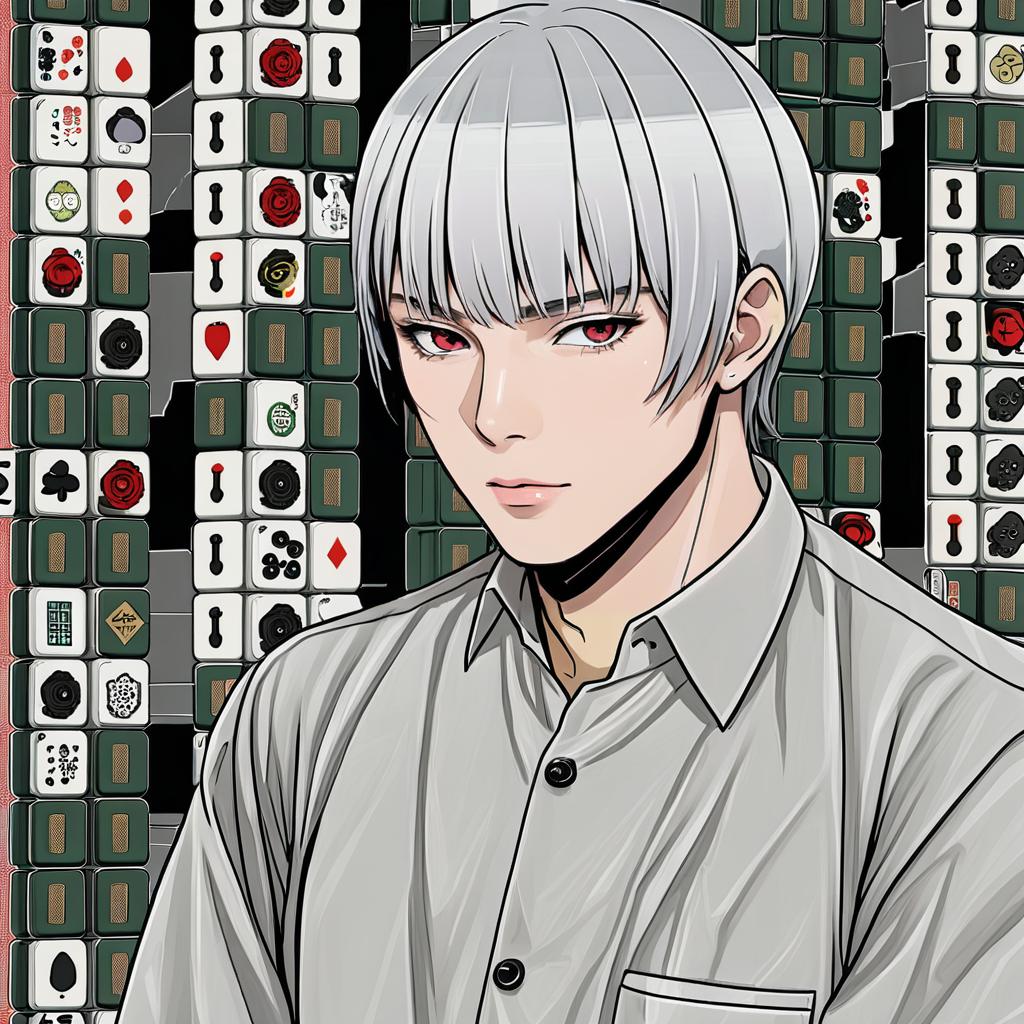 Digital anime-style illustration of a young male character with short, white hair and medium bangs. He has red eyes and a fair complexion, wearing a light grey collared shirt. The background consists of stacked mahjong tiles in white and dark green tones, featuring various symbols and designs. The art style is reminiscent of the works of artists Akagi Shigeru and Fukumoto, with strong line work and detailed shading.
