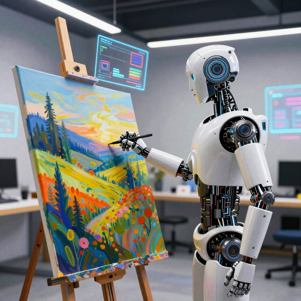 AI generated art depicting a cybernetic humanoid artist painting in a sleek studio with holographic canvases, combining realistic textures and futuristic digital effects, capturing the fusion of human creativity and machine intelligence in a contemporary setting.