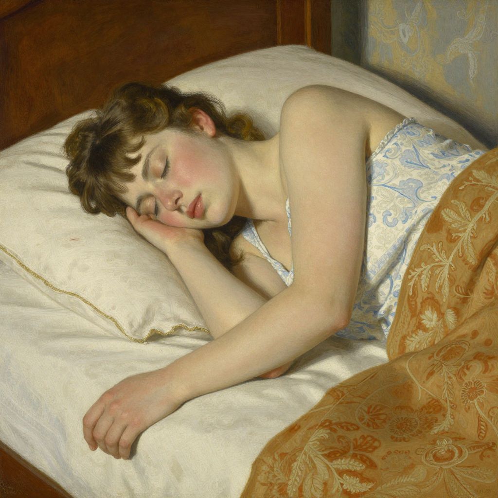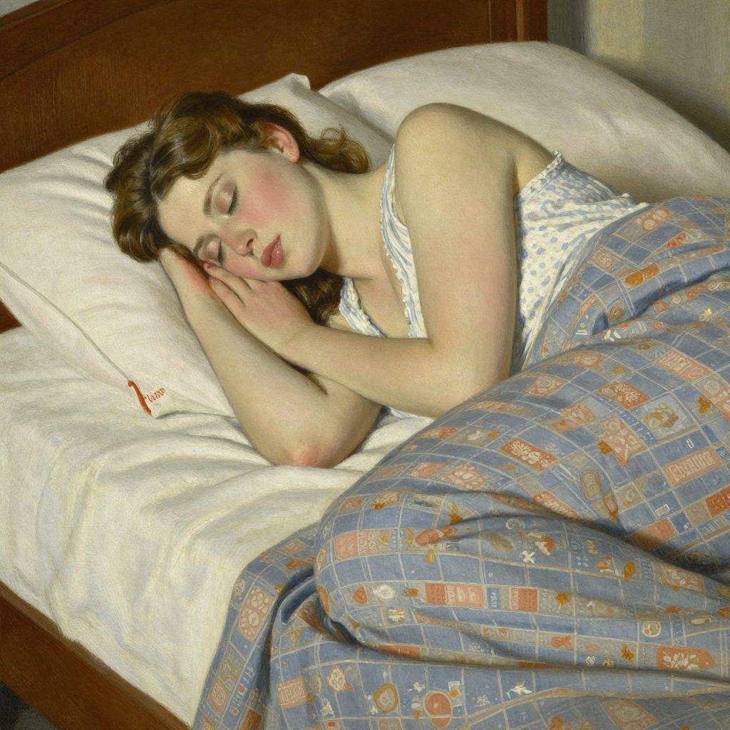 A vintage-style illustration reminiscent of Philip Pearlstein's realism, depicting a serene woman sleeping peacefully on a bed with a retro aesthetic, rendered in high-definition detail with soft, natural lighting.