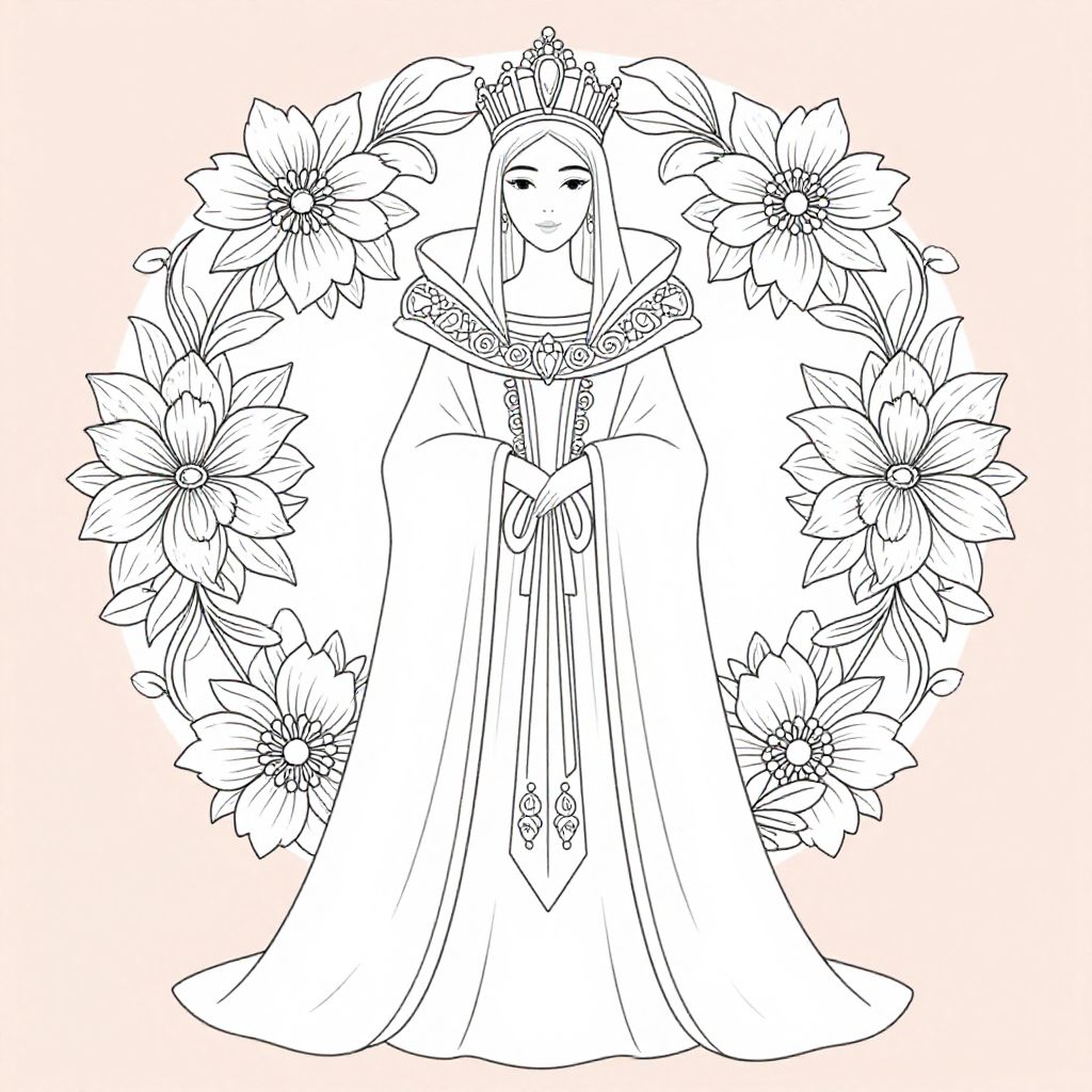Black and white line drawing of a regal woman standing centrally, wearing a long, flowing gown with intricate neck and sleeve details, and a crown adorned with jewels. She has straight, shoulder-length hair. Surrounding her are large, detailed flowers with prominent petals and centers, forming a circular frame. The woman's expression is calm and composed, with her hands gently clasped in front. The drawing has a clean, precise, and symmetrical style, focusing on elegant, royal themes. The background is plain, emphasizing the detailed linework and floral arrangement.