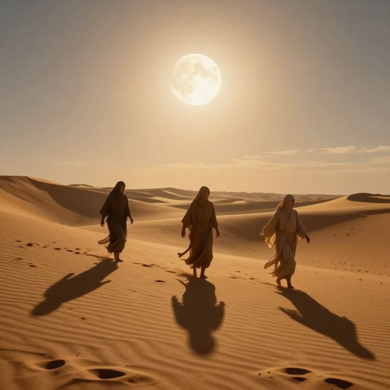 Photograph of three silhouetted figures walking in a vast, sunlit desert with rippled sand dunes. The sun is high in the sky, casting long shadows of the figures and creating a golden-orange glow. The figures wear flowing, loose garments, indicating traditional or historical attire. The background shows undulating sand dunes under a clear, blue sky with a few wispy clouds. The scene evokes a sense of journey or pilgrimage in a timeless, arid landscape.