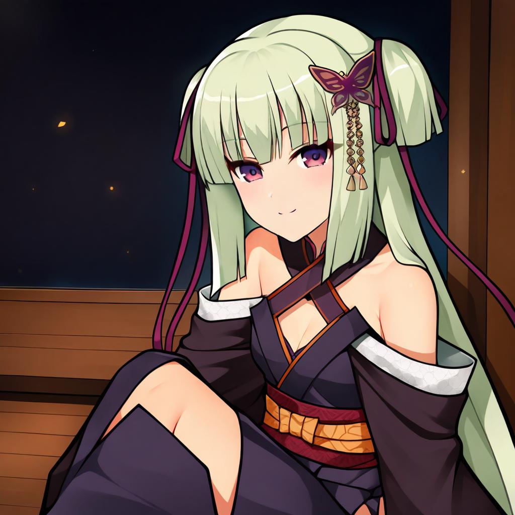 This digital anime-style drawing features a young woman with long, pale green hair, purple eyes, and a small smile. She wears a black kimono with white trim and a red-orange obi belt. A purple butterfly hair accessory with gold chains dangles from her right side. She is seated, with her left knee up, in a wooden room with a dark, star-speckled night sky visible through a window in the background. The image has a soft, glowing effect, highlighting her serene expression and delicate features.