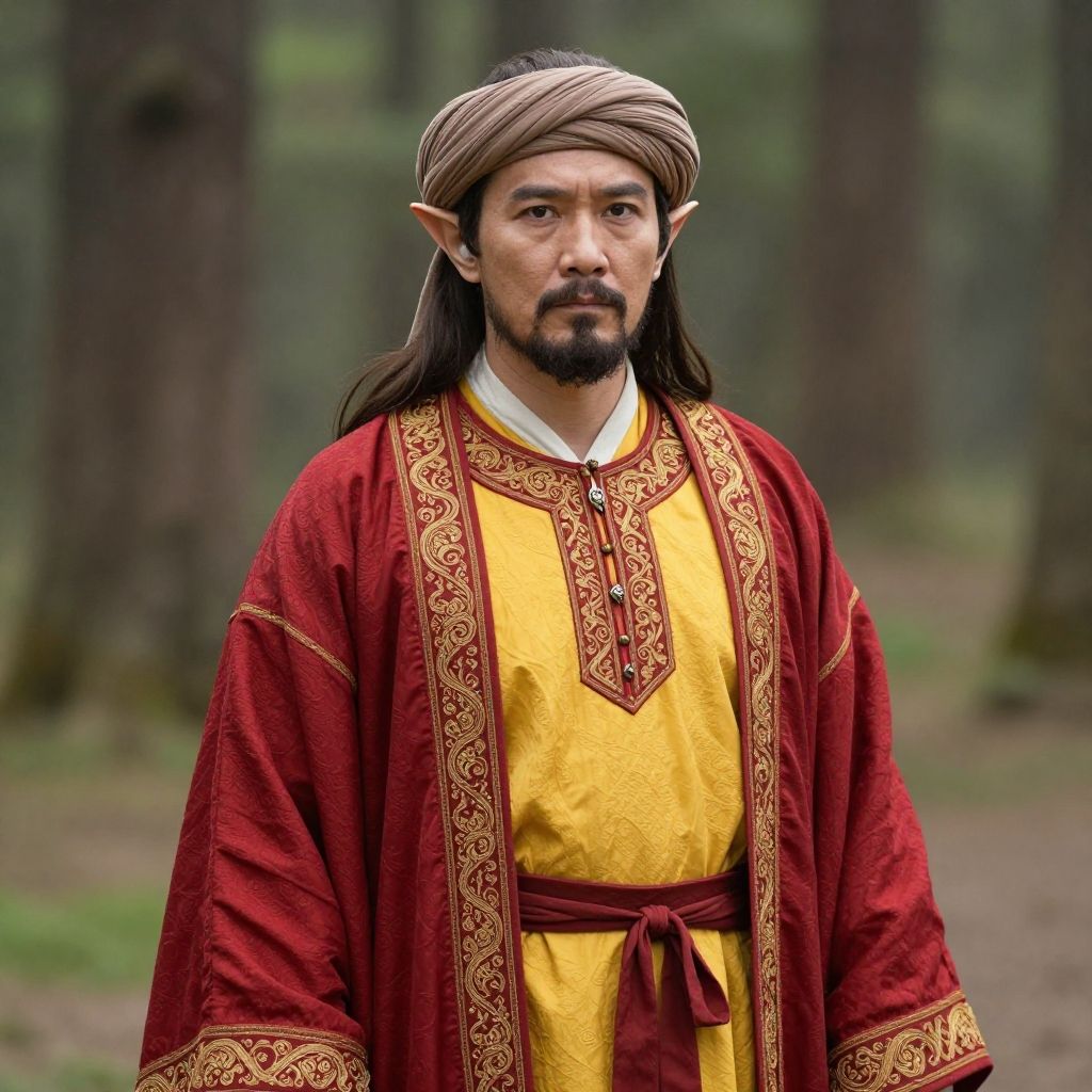Photograph of a Middle Eastern man with long dark brown hair, a trimmed beard, and pointed elf-like ears, standing in a forest. He wears a red and gold embroidered robe over a yellow tunic, with a red belt, and a brown turban. His expression is serious, and the forest background is blurred, featuring tall trees and greenery. The colors of his outfit are vibrant, contrasting with the natural, muted tones of the forest. The lighting is natural, highlighting his face and attire.