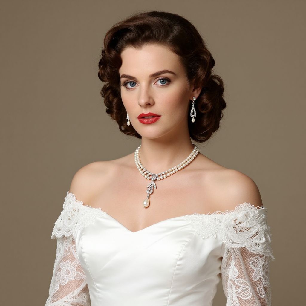 A stunning woman with blue eyes styled in elegant, vintage curls poses in an off-shoulder white satin gown adorned with delicate lace sleeves. She accessorizes with a dazzling pearl and diamond necklace matching her drop earrings, exuding timeless beauty and sophistication in a classic portrait style.