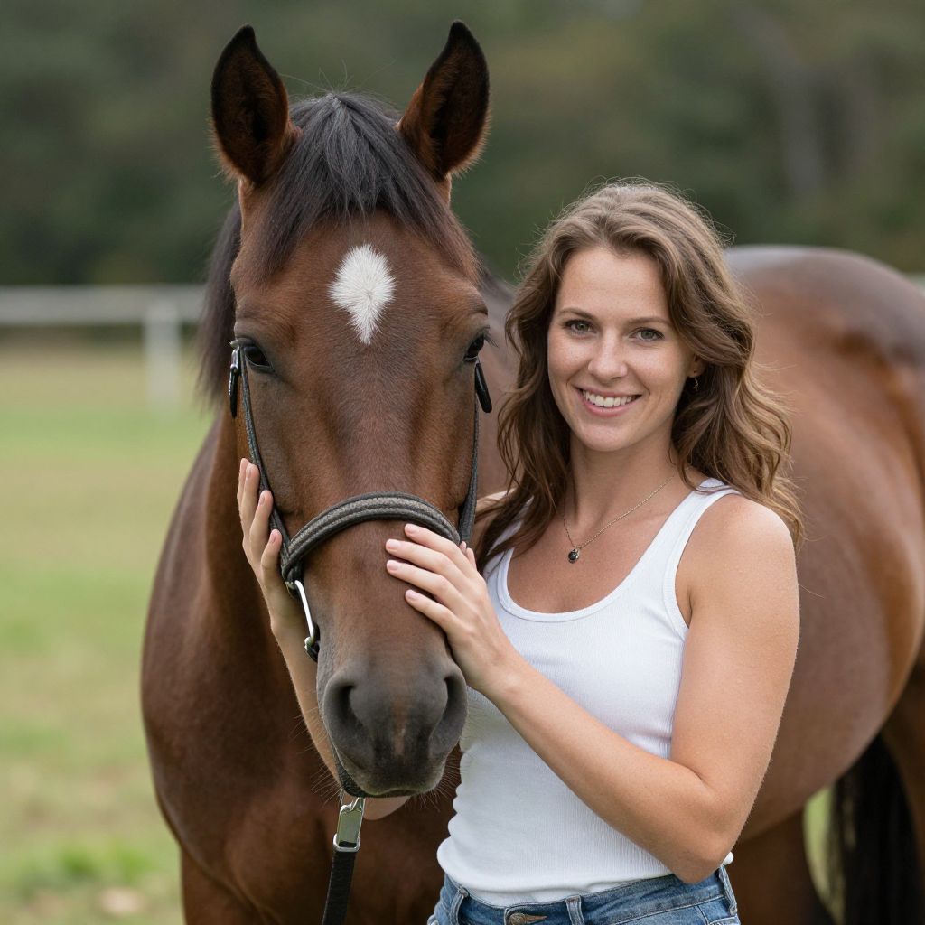 Smiling woman standing beside a brown horse with a white star on its forehead, gently holding the horse's muzzle in a serene outdoor field.