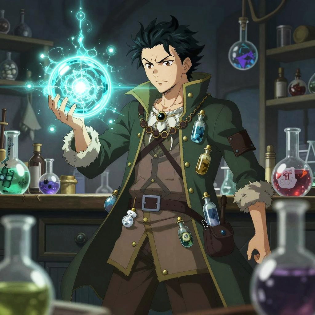 A sly alchemist, wearing a patched coat covered in vials and potions, wielding a mysterious orb radiating magical energy, in a cluttered laboratory filled with glowing flasks, illustrated in the dynamic and mystical anime style of Koyoharu Gotouge.