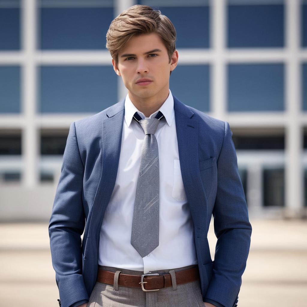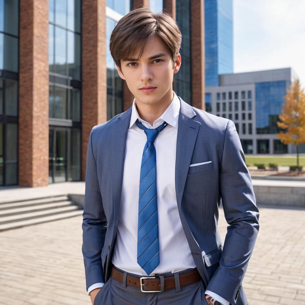 Portrait of a young man wearing a blue suit with a white shirt and patterned blue tie, standing outside a modern office building with glass windows and greenery in the background. The man has light brown hair and a confident expression, with hands in his pockets.