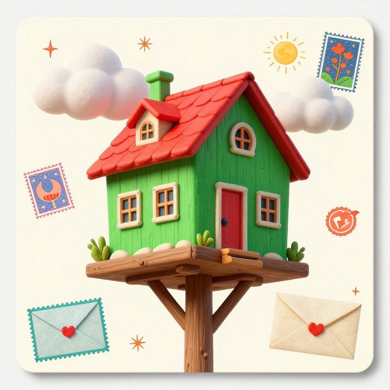 Colorful wooden playhouse with a brown roof, arched door, circular window, birdhouse, and potted flowers on a grassy base.