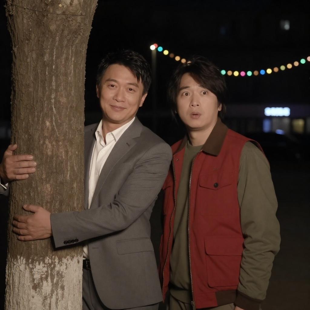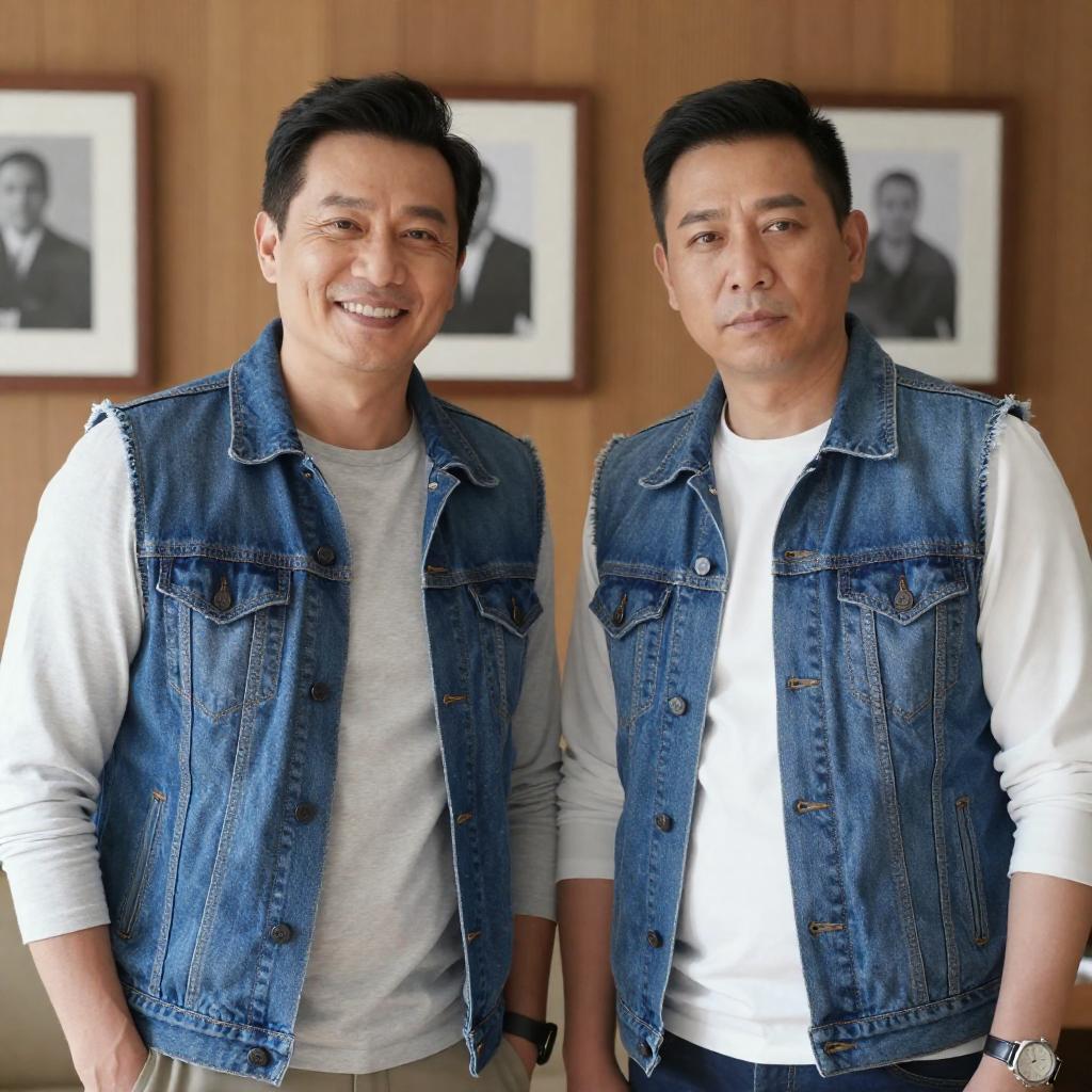 Photograph of two Asian men standing in a grassy field with cows in the background. One man is wearing a brown jacket and tan hat, the other is dressed in a blue jacket and dark blue cap. Both men are pointing at each other with neutral expressions. The image is framed with a yellow and blue circular border, featuring a colorful cartoon character on the left side.
