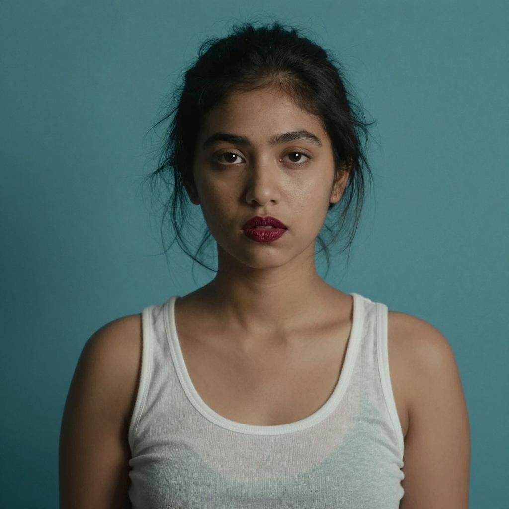 Photograph of a young woman with medium skin tone and dark, messy hair pulled back. She's wearing a white, slightly sheer tank top, exposing her shoulders. Her dark red lipstick stands out against the bright turquoise background. The lighting creates a dramatic shadow effect, highlighting her facial features and giving a slightly intense, mysterious vibe.