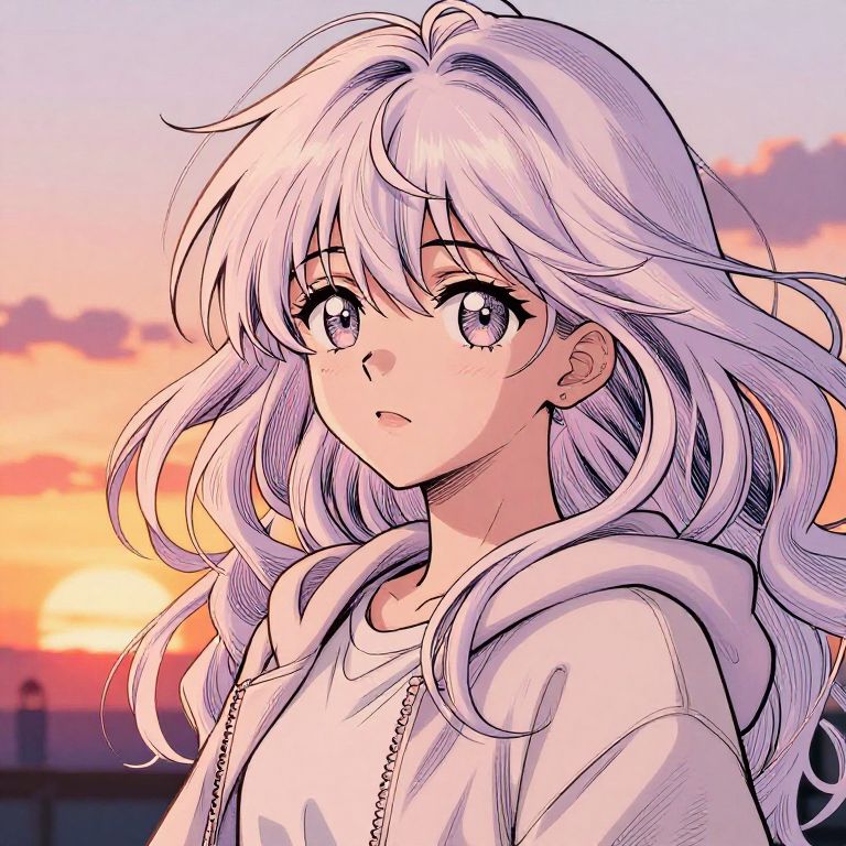 Digital anime-style drawing of a young woman with long, wavy white hair, large purple eyes, and a white hoodie, against a vibrant sunset background