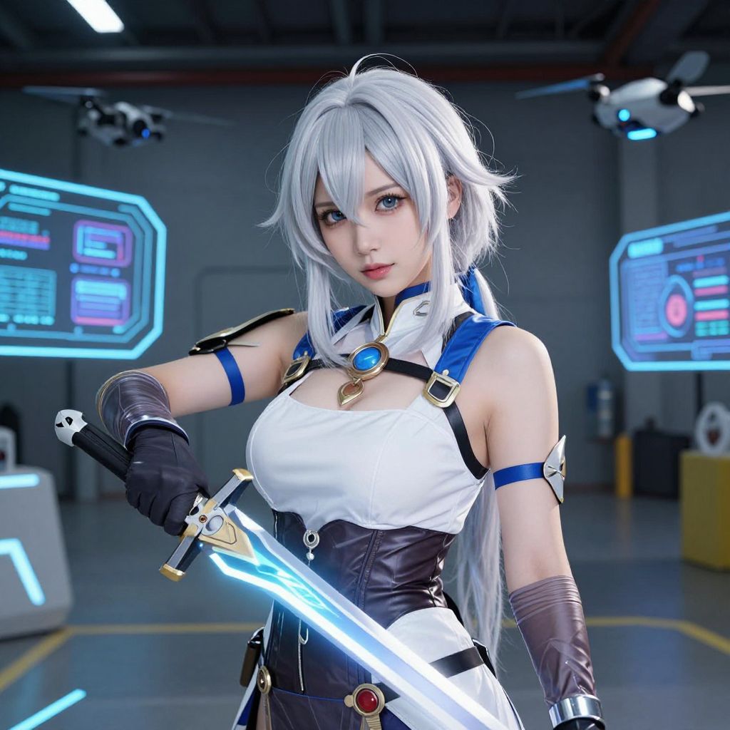 CGI image of a silver-haired anime woman in a white and black sci-fi outfit, holding a glowing sword, standing in a futuristic lab with holog