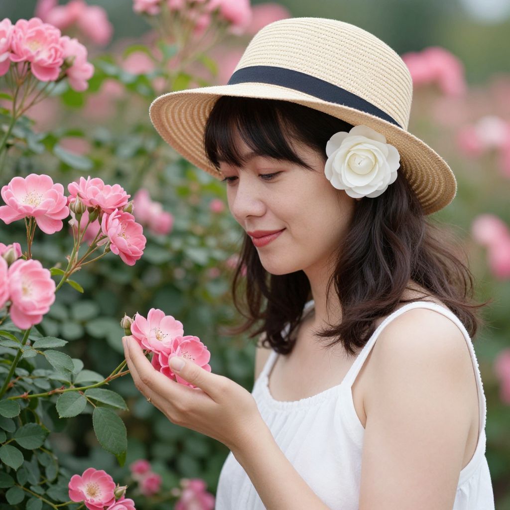 Woman wearing a beige straw hat adorned with a white rose stands gracefully amidst a vibrant garden of pink roses, her hand gently cradling two delicate blooms while her warm smile radiates serenity.