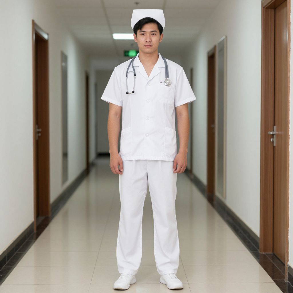 Nurse Outfit Male Costume, male doctor in white uniform standing in a hallway