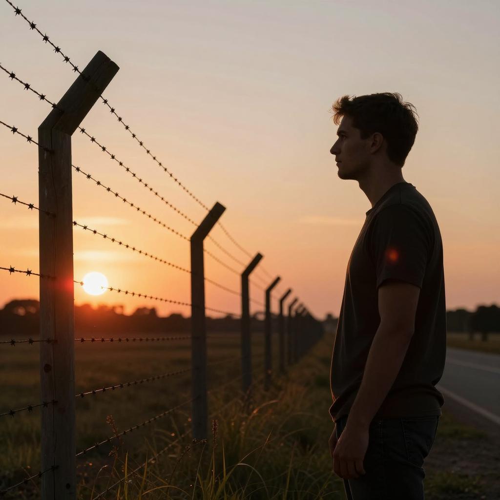Silhouetted man with short hair stands in profile beside barbed wire fence. Sun sets in background, casting orange glow. Multiple wooden posts with coiled barbed wire stretch into distance. Grass and field extend to horizon. Red lens flare in lower left.