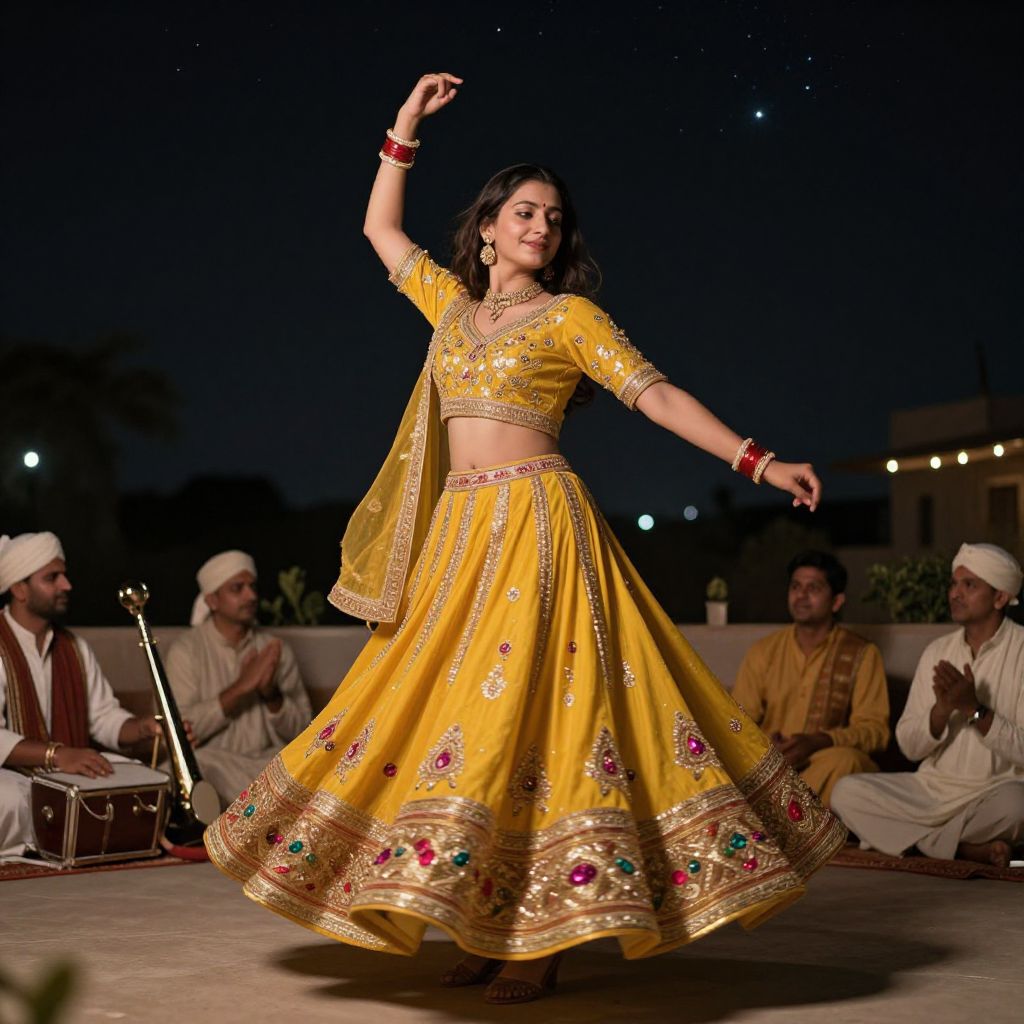 Punjabi prompt latest: A young Punjabi woman in a traditional lehenga dancing under a starry night sky, surrounded by traditional instruments and family, glowing with soft ambient light, realistic skin tones, and dynamic motion, Dall-E inspired.