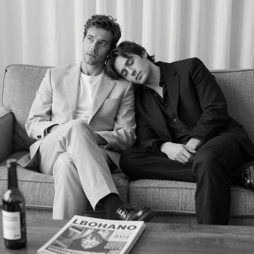 Photograph of two men in an intimate moment. The man in the foreground has light brown hair, blue eyes, and a neutral expression, lying back with his head resting on the other man's hand. The second man, with dark hair and brown eyes, leans close, nuzzling the first man's neck, wearing a brown knit sweater and a gray shirt with buttons. The background is a plain white wall. Both men have light skin.