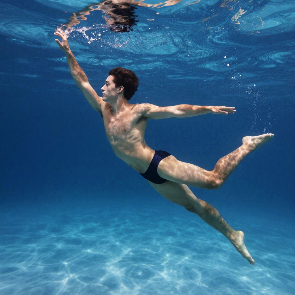 Trans guy swimwear in an artistic underwater scene, dynamic poses, flowing fabric, serene blue hues, capturing movement and freedom, ethereal and expressive visual style