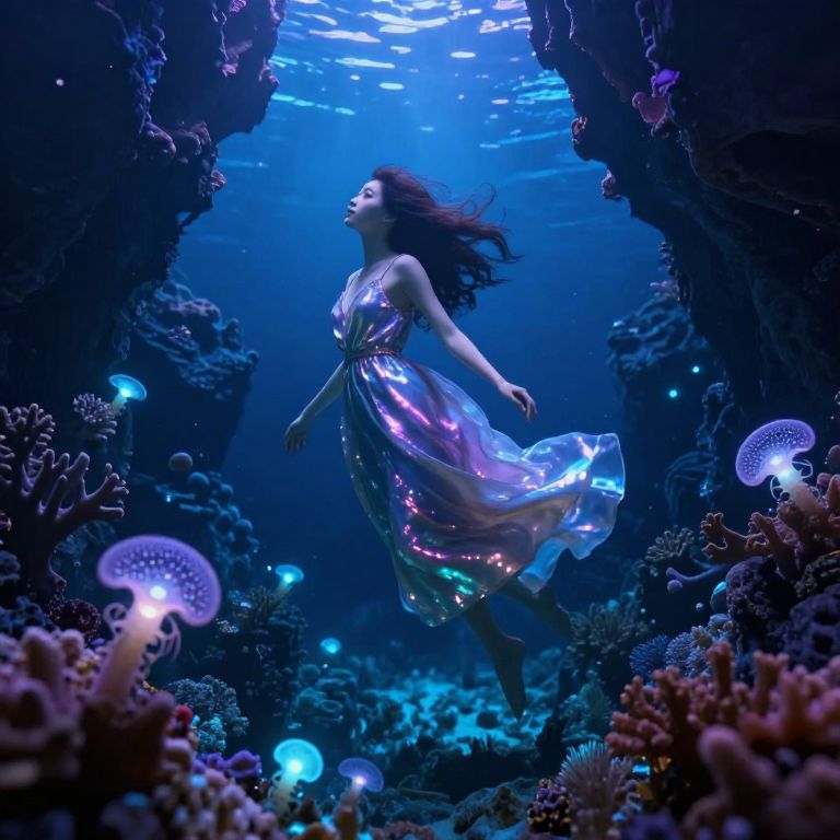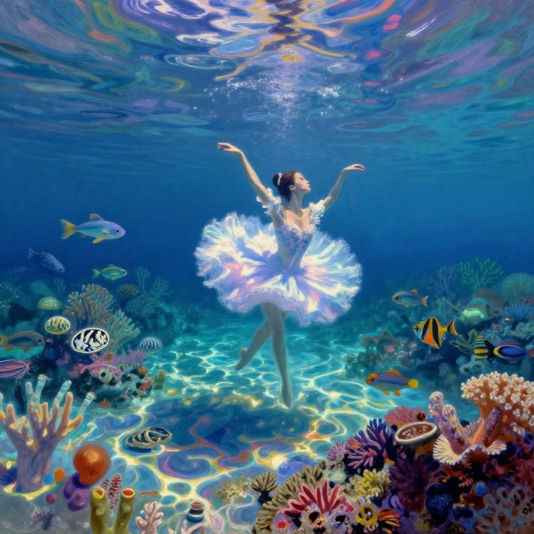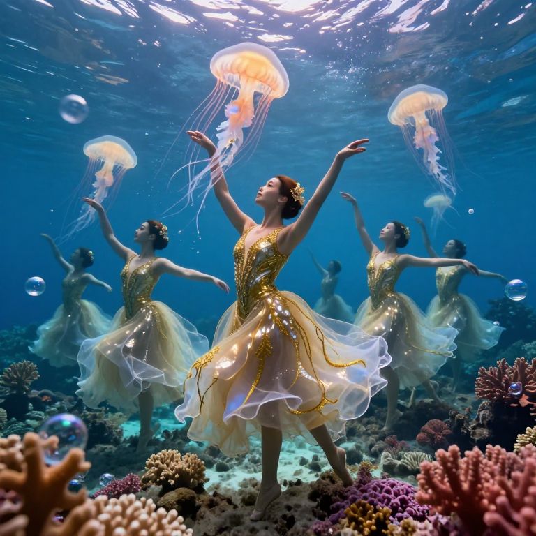 Craft an image showcasing a dreamlike underwater ballet featuring graceful jellyfish dancing in a surrealist manner. These luminescent creatures perform amidst ancient sunken ruins adorned with vibrant coral and algae, casting enchanting shadows on the ocean floor. Employ impressionistic lighting techniques with soft, ethereal glowing light emanating from the jellyfish, illuminating the mysterious underwater landscape and evoking a sense of wonder and enchantment.