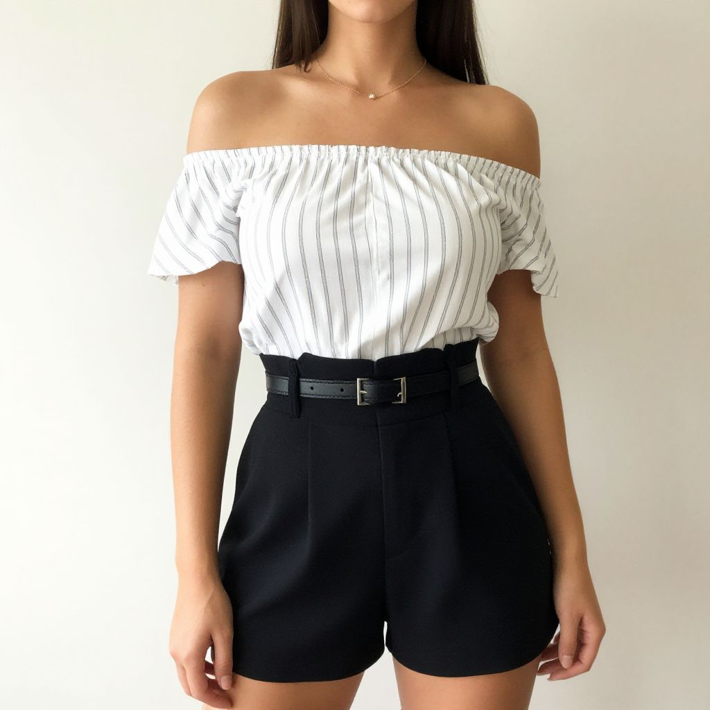 Photograph of a young woman with long dark hair, wearing an off-the-shoulder, white, pinstriped blouse with gathered sleeves and high-waisted, black, belted shorts. She has a fair to medium skin tone and is standing against a plain white background. The blouse is slightly fitted, accentuating her slender physique, and the shorts have a structured, tailored look. She wears a simple gold necklace. The image is well-lit with bright, even lighting, highlighting the contrast between her white top and black shorts.