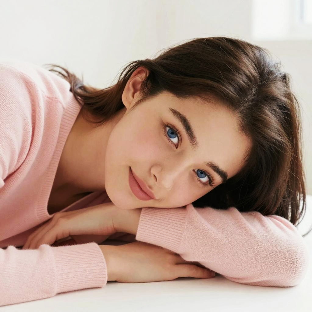 Photograph of a young woman with long, dark brown hair and light skin, lying down and resting her head on her right hand. She's wearing a soft pink sweater and has a relaxed, slight smile. Her blue eyes are looking directly at the camera, and the background is a bright white, making her the clear focus. The image has a warm, natural light.